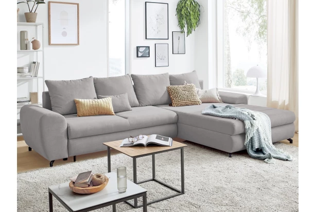 Atraktivní rohová sedací souprava se zaoblenými tvary nabízí příjemně měkký styl sezení pro Váš každodenní komfort. Očalouněna látkou v barvě světle šedá. Další přidanou hodnotou je praktický úložný prostor a navíc rozkládací funkce – díky ní se sedačka snadno promění na příležitostné lůžko třeba pro návštěvu. Díky univerzálně řešené konstrukci lze sedačku sestavit jako pravý anebo levý roh, respektive s otomanem na pravé anebo levé straně – sedačka se tak lépe přizpůsobí prostorovým možnostem Vašeho obýváku.