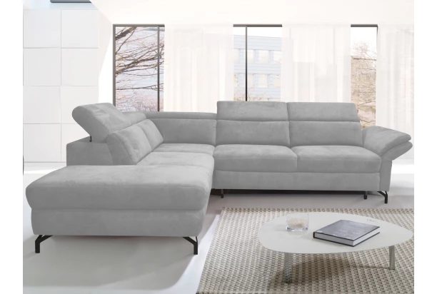 Atraktivní rohová sedací souprava na černých kovových nohách podle aktuálních trendů. Komfortně měkké sezení doplňují polohovatelné zádové opěrky, díky kterým si přizpůsobíte pohodlí podle vlastní potřeby. Potažena látkou v odstínu světle šedá. Varianta rohové sedačky s otomanem vlevo, s polohováním boční područky, rozkládací funkcí na lůžko a s praktickým úložným prostorem.