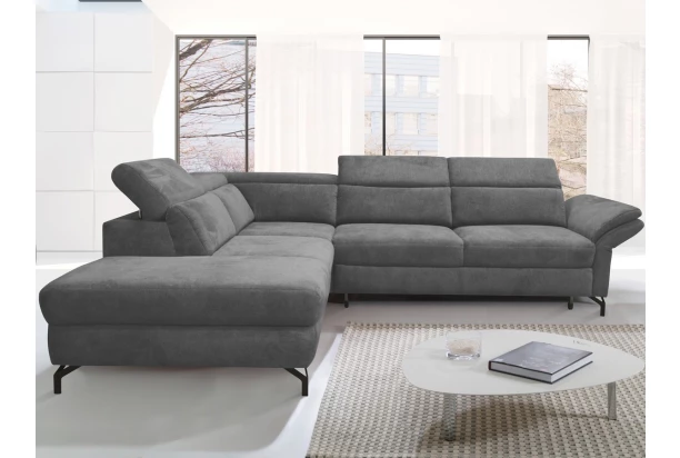 Atraktivní rohová sedací souprava na černých kovových nohách podle aktuálních trendů. Komfortně měkké sezení doplňují polohovatelné zádové opěrky, díky kterým si přizpůsobíte pohodlí podle vlastní potřeby. Potažena látkou v odstínu myší středně šedá. Varianta rohové sedačky s otomanem vlevo, s polohováním boční područky, rozkládací funkcí na lůžko a s praktickým úložným prostorem.