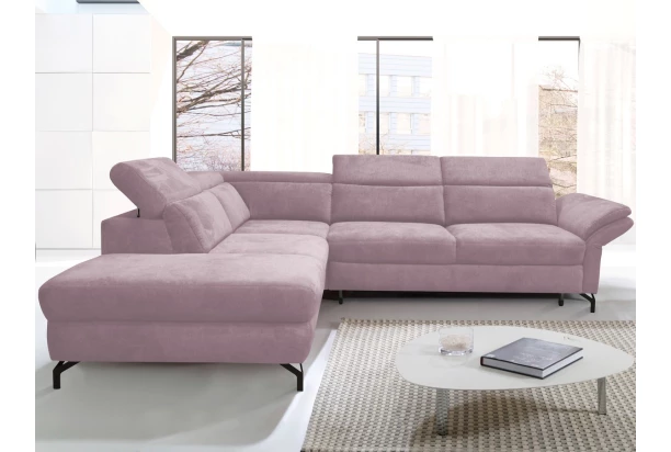Atraktivní rohová sedací souprava na černých kovových nohách podle aktuálních trendů. Komfortně měkké sezení doplňují polohovatelné zádové opěrky, díky kterým si přizpůsobíte pohodlí podle vlastní potřeby. Potažena látkou v odstínu růžová. Varianta rohové sedačky s otomanem vlevo, s polohováním boční područky, rozkládací funkcí na lůžko a s praktickým úložným prostorem.