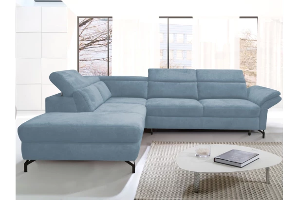 Atraktivní rohová sedací souprava na černých kovových nohách podle aktuálních trendů. Komfortně měkké sezení doplňují polohovatelné zádové opěrky, díky kterým si přizpůsobíte pohodlí podle vlastní potřeby. Potažena látkou v odstínu šedo-modrá. Varianta rohové sedačky s otomanem vlevo, s polohováním boční područky, rozkládací funkcí na lůžko a s praktickým úložným prostorem.
