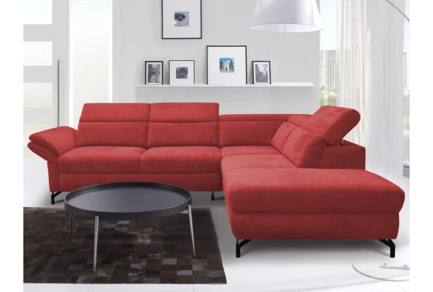 Atraktivní rohová sedací souprava na černých kovových nohách podle aktuálních trendů. Komfortně měkké sezení doplňují polohovatelné zádové opěrky, díky kterým si přizpůsobíte pohodlí podle vlastní potřeby. Potažena látkou v odstínu šípkově červená. Varianta rohové sedačky s otomanem vpravo, s polohováním boční područky, rozkládací funkcí na lůžko a s praktickým úložným prostorem.
