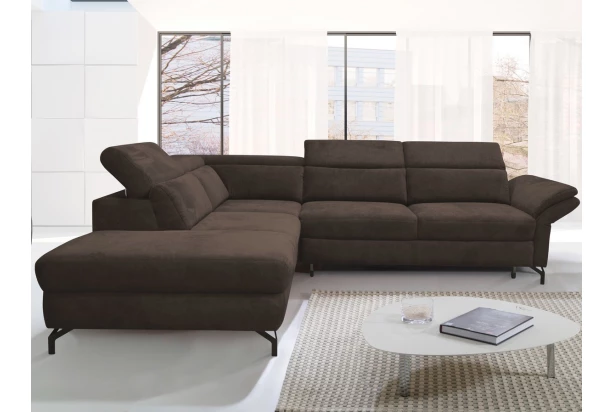 Atraktivní rohová sedací souprava na černých kovových nohách podle aktuálních trendů. Komfortně měkké sezení doplňují polohovatelné zádové opěrky, díky kterým si přizpůsobíte pohodlí podle vlastní potřeby. Potažena látkou v odstínu tmavě hnědá. Varianta rohové sedačky s otomanem vlevo, s polohováním boční područky, rozkládací funkcí na lůžko a s praktickým úložným prostorem.