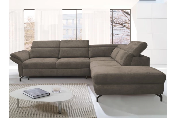 Atraktivní rohová sedací souprava na černých kovových nohách podle aktuálních trendů. Komfortně měkké sezení doplňují polohovatelné zádové opěrky, díky kterým si přizpůsobíte pohodlí podle vlastní potřeby. Potažena látkou v odstínu světle hnědá. Varianta rohové sedačky s otomanem vpravo, s polohováním boční područky, rozkládací funkcí na lůžko a s praktickým úložným prostorem.