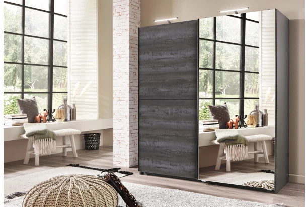 Šatní skříň se zrcadlem a posuvnými dveřmi o šířce 180 cm zaujme na pohled imitací šedé vintage oceli. Ideálně doplní mladistvý interier v městském industriálním stylu.
