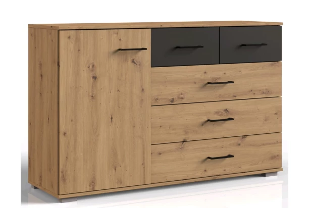 Komoda se zásuvkami z programu Coventry o šířce 130 cm obsahuje 1 otočné dveře a 5 úložných zásuvek o různých velikostech pro přehledné ukládání. Vyrobena v působivé kombinaci útulného dřevodekoru dub artisan s imitací antracitové broušené oceli. Praktický a zároveň moderní nábytek pro Váš útulný domov.