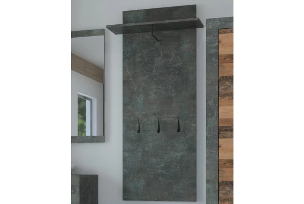 Věšákový panel obsahuje horní polici, šatní tyč a tři věšáky. Imitace tmavě šedého betonu zaujme na pohled a dokonale doplní stylově zařízený prostor předsíně.