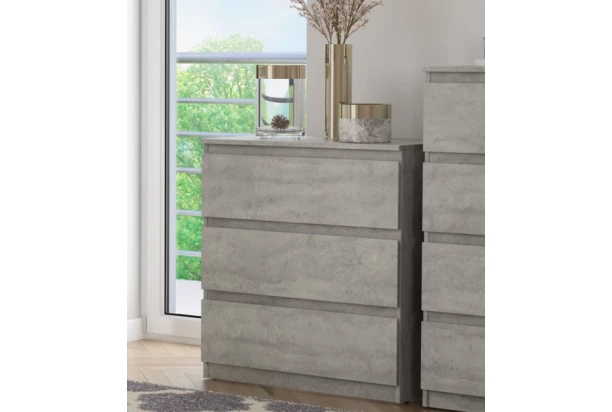Zásuvková komoda o výšce 80 cm v imitaci šedého betonu obsahuje 3 zásuvky a nabízí praktické úložné prostory, účelnost a čisté linie tvarů, které se hodí do každého interieru.