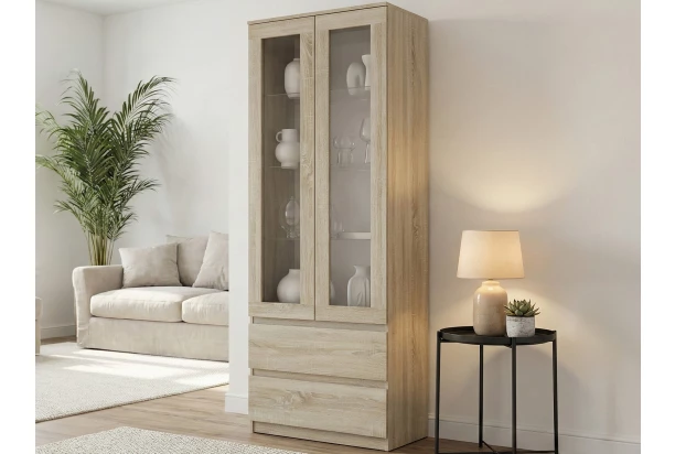 Vysoká vitrína o šířce 70 cm v dekoru dub sonoma nabízí praktické úložné prostory, účelnost a čisté linie tvarů, které se hodí do každého interieru. Za otočnými prosklenými dvířky se nachází 3 skleněné police, kam můžete vystavit dekorace, fotky anebo třeba skleničky. Do 2 spodních šuplíků můžete uschovat dokumenty, textil nebo jiné drobnosti. Tato úzká vitrína s prosklením skvěle zapadne do obývacího pokoje, jídelny i ložnice.