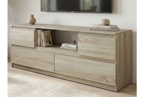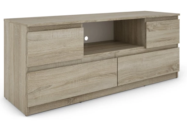 TV skříňka o šířce 140 cm v dekoru dub sonoma nabízí praktické úložné prostory, účelnost a čisté linie tvarů, které se hodí do každého interieru. TV stolek je vybaven otevřenou přihrádkou pro umístění elektroniky, dvěma prostornými zásuvkami a dvěma výklopnými dvířky, které elegantně skryjí další drobnosti a příslušenství.