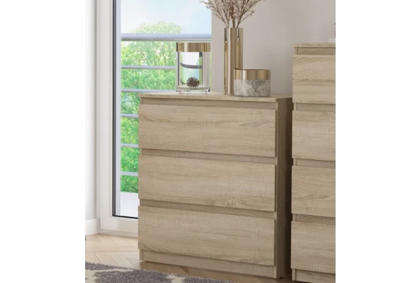 Zásuvková komoda o výšce 80 cm v dekoru dub sonoma obsahuje 3 zásuvky a nabízí praktické úložné prostory, účelnost a čisté linie tvarů, které se hodí do každého interieru.