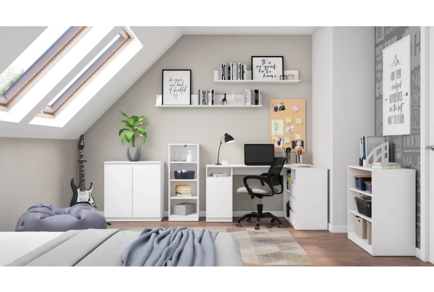 Nízký regál o šířce 40 cm v bílé barvě nabízí praktické úložné prostory, účelnost a čisté linie tvarů, které se hodí do každého interieru. Police lze výškově nastavovat.