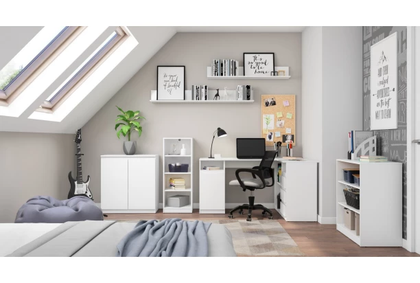 Nízký regál o šířce 75 cm v bílé barvě nabízí praktické úložné prostory, účelnost a čisté linie tvarů, které se hodí do každého interieru. Police lze výškově nastavovat.
