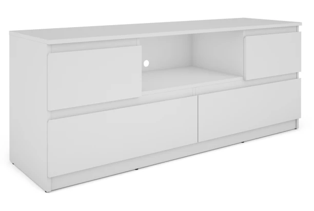 TV skříňka o šířce 140 cm v bílé barvě nabízí praktické úložné prostory, účelnost a čisté linie tvarů, které se hodí do každého interieru. TV stolek je vybaven otevřenou přihrádkou pro umístění elektroniky, dvěma prostornými zásuvkami a dvěma výklopnými dvířky, které elegantně skryjí další drobnosti a příslušenství.