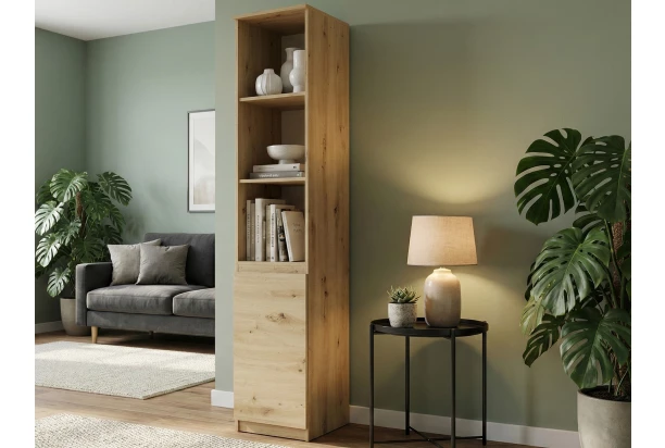 Úzký regál s dvířky o šířce 40 cm v dekoru dub artisan nabízí praktické úložné prostory, účelnost a čisté linie tvarů, které se hodí do každého interieru. Odkládací police jsou ideální pro vystavení knih, dekorací a dalších předmětů. Za otočnými dvířky se skrývá praktický úložný prostor s policí, který vám pomůže udržet pořádek v domácnosti.