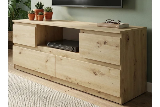 TV skříňka o šířce 140 cm v dekoru dub artisan nabízí praktické úložné prostory, účelnost a čisté linie tvarů, které se hodí do každého interieru. TV stolek je vybaven otevřenou přihrádkou pro umístění elektroniky, dvěma prostornými zásuvkami a dvěma výklopnými dvířky, které elegantně skryjí další drobnosti a příslušenství.