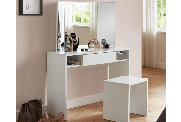 Praktický kosmetický stolek s přihrádkami, zásuvkou a 3-dílým zrcadlem ocení každá správná žena. Bílý toaletní stolek je univerzální pro jakoukoliv ložnici či šatnu.