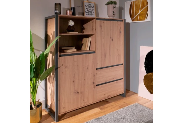 Vysoká skříňka v kombinaci dveří, zásuvek a otevřených přihrádek z kolekce Denver – nábytek v městském industriálním stylu působí velmi moderně a dává Vám možnost vytvářet designové interiery v mladistvém duchu. Příjemné útulné tóny dřevodekoru dub artisan doplňují antracitově šedé linie a široké boční rámy, díky kterým je nábytek nezaměnitelný.