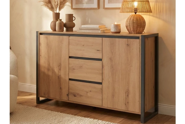 Komoda se zásuvkami z kolekce Denver – nábytek v městském industriálním stylu působí velmi moderně a dává Vám možnost vytvářet designové interiery v mladistvém duchu. Příjemné útulné tóny dřevodekoru dub artisan doplňují antracitově šedé linie a široké boční rámy, díky kterým je nábytek nezaměnitelný.
