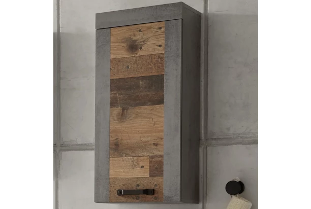 Nástěnná koupelnová skříňka z programu Indiana – zaujme na pohled a dokonale doplní stylově zařízenou koupelnu. Vyrobena v kombinaci tmavě šedého betonu s vintage optikou dřevěných prken.