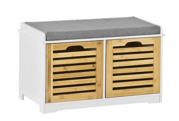Bílá lavice se 2 dřevěnými zásuvkami a měkkým sedacím polštářem vytvoří útulné domácké prostředí. Poslouží jako malý předsíňový botník nebo univerzální úložný prostor na drobnosti.