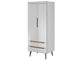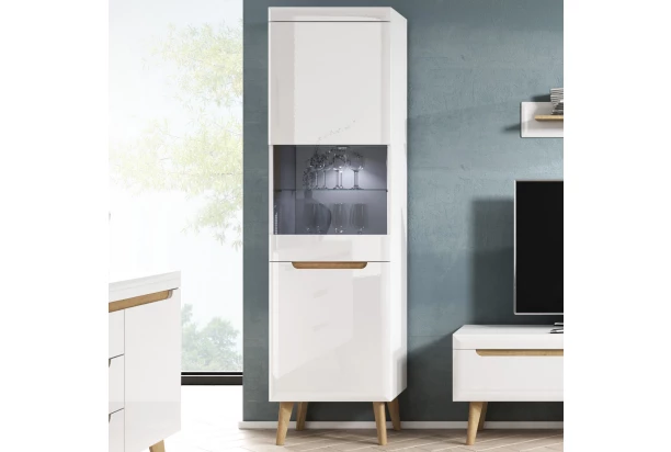 Vysoká vitrína z kolekce Nordi – inspirujte se útulným severským stylem. Moderní nábytek se zaoblenými hranami doplňují masivní dřevěné nožky, které dodávají interieru lehkost a svěží vzhled. Leskle bílé plochy podkreslují čelní linie v dubovém dřevodekoru, díky kterým nábytek skvěle vynikne.