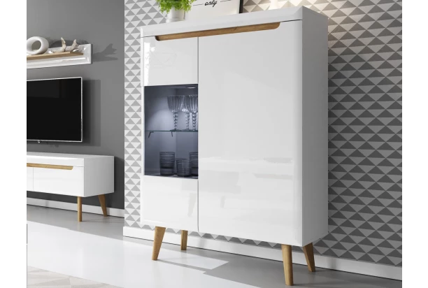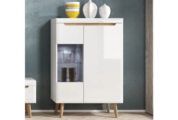 Nízká vitrína z kolekce Nordi – inspirujte se útulným severským stylem. Moderní nábytek se zaoblenými hranami doplňují masivní dřevěné nožky, které dodávají interieru lehkost a svěží vzhled. Leskle bílé plochy podkreslují čelní linie v dubovém dřevodekoru, díky kterým nábytek skvěle vynikne.