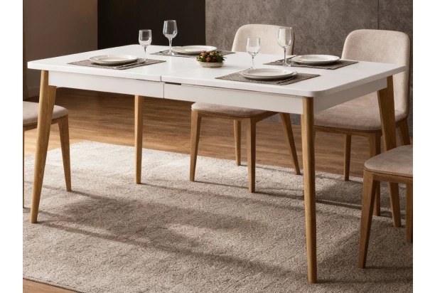 Rozkládací jídelní stůl z kolekce Nordi – inspirujte se útulným severským stylem. Moderní nábytek v kombinaci dub/bílá doplňují masivní dřevěné nohy, které dodávají interieru lehkost a svěží vzhled.