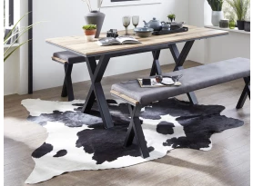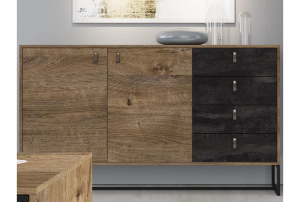 Široká komoda z kolekce Dark – dodejte Vašemu bytu nádech extravagance s nábytkem v industriálním stylu. Povrchy v příjemném dubovém dřevodekoru a imitaci černého lávového kamene doplňuje kovová podnož a originální úchyty z pravé kůže.