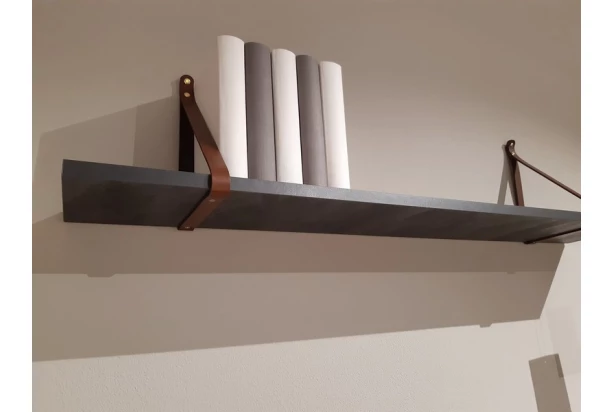 Nástěnná police z kolekce Dark – dodejte Vašemu bytu nádech extravagance s nábytkem v industriálním stylu. Povrchy v imitaci černého lávového kamene doplňuje originální zavěšení z pravé kůže.