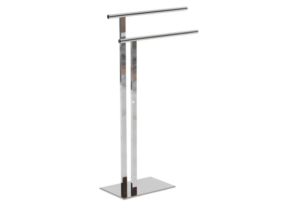 Kovový stojan na ručníky v lesklém provedení se hodí do každé moderně zařízené koupelny. Může posloužit i v kuchyni pro odkládání utěrek.