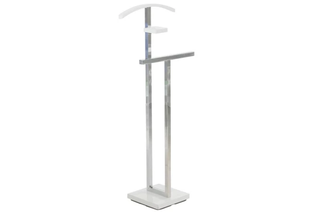 Němý sluha pro odkládání ošacení obsahuje navíc malý držák pro praktické uložení hodinek nebo šperků. Vyroben v kombinaci bílá/chromový lesk.
