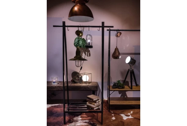 Stylový stojací věšák má stabilní konstrukci z černého kovu a praktické odkládací police v optice vintage dřeva. Poslouží v předsíni, šatně nebo třeba ložnici.