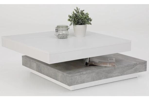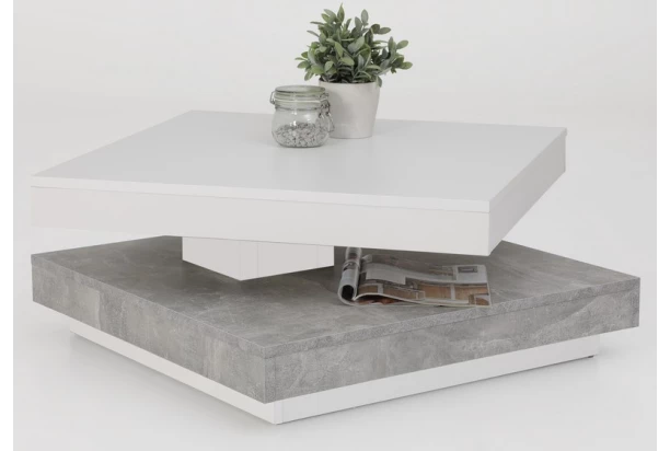 Designový čtvercový stolek v kombinaci bílých ploch s imitací šedého betonu. Jeho členitou konstrukci lze otáčet – praktický i nápaditý stolek se tak hodí do každého moderního interieru.