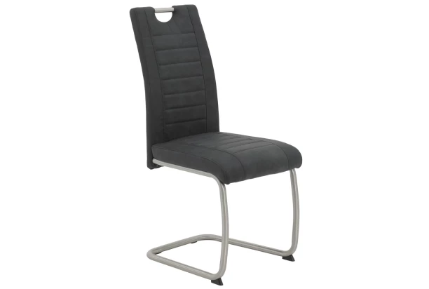 Pohodlně tvarovaná jídelní židle na kovové podnoži je vybavena praktickým madlem pro snazší manipulaci. Látkový potah v antracitové vintage optice doplňuje zajímavé prošívání. Židle se také vyznačuje zvýšenou nosností.