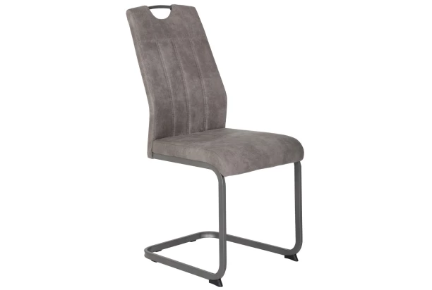Jídelní židle na kovové podnoži má pohodlný sedák očalouněn šedou látkou ve stylové vintage optice. Ideální do moderní jídelny.