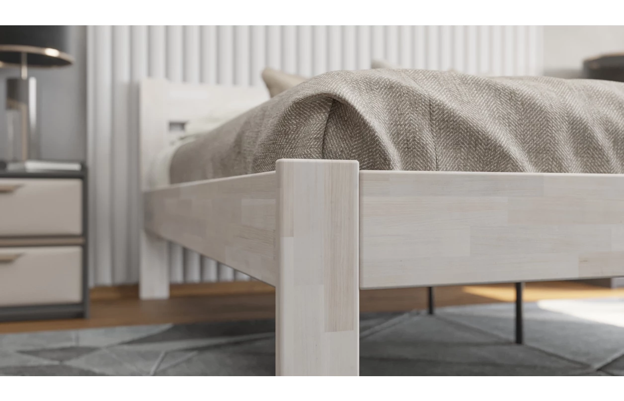 - rohové spoje postelového rámu: tradiční a velice pevné rohové spojení systémem závrtné matice a šroubového táhla s přídavnými kolíky – takové rohové spojení u celomasivní postele lze právem považovat za nejpevnější a nejodolnější vůči dynamickému zatížení postele