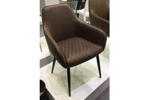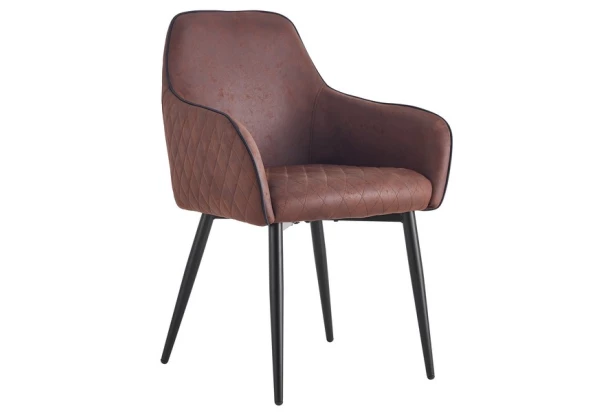 Pohodlně zaoblená židle na černých kovových nohách je očalouněna hnědou látkou ve vintage optice broušené kůže. Doplněna atraktivním proševem na sedáku a vnějších stranách. Skvělě tak doplní stylovou jídelnu.