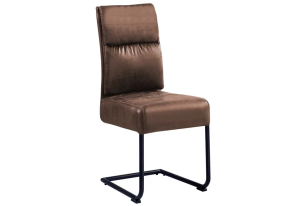 Velmi komfortní jídelní židle na kovové podnoži zaujme již na pohled svým látkovým potahem ve vintage optice hnědé strukturované kůže. Měkoučký opěrák v designu nadýchaného polštáře si zamilujete během každého sezení.