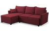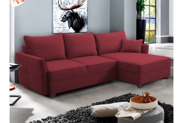Elegantní rohová sedací souprava si Vás získá pro komfortně měkké sezení i praktičnost – očalouněna příjemnou tkaninou v barvě červená, součástí je rozkládací funkce na lůžko, úložný prostor i kapsy pro ukládání časopisů. Ideálními rozměry a univerzálním umístěním otomanu na pravou/levou stranu pasuje téměř do každého obýváku.