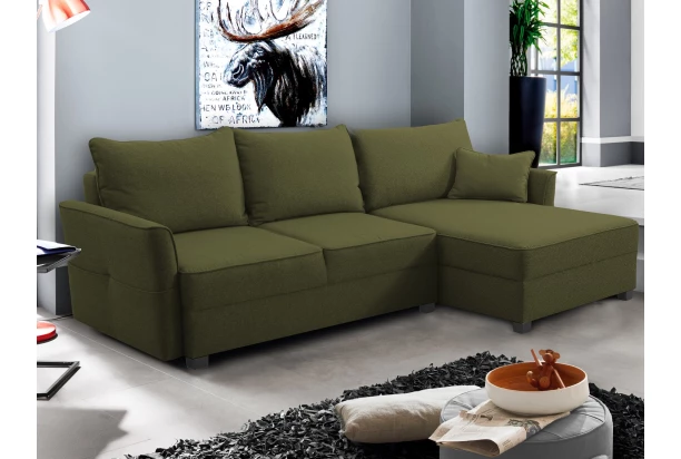 Elegantní rohová sedací souprava si Vás získá pro komfortně měkké sezení i praktičnost – očalouněna příjemnou tkaninou v barvě olivově zelená, součástí je rozkládací funkce na lůžko, úložný prostor i kapsy pro ukládání časopisů. Ideálními rozměry a univerzálním umístěním otomanu na pravou/levou stranu pasuje téměř do každého obýváku.