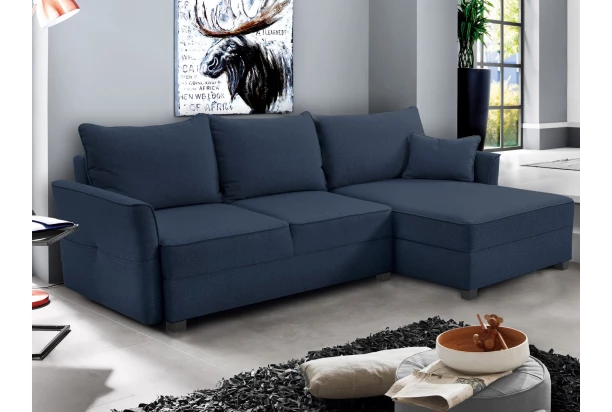 Elegantní rohová sedací souprava si Vás získá pro komfortně měkké sezení i praktičnost – očalouněna příjemnou tkaninou v barvě tmavě modrá, součástí je rozkládací funkce na lůžko, úložný prostor i kapsy pro ukládání časopisů. Ideálními rozměry a univerzálním umístěním otomanu na pravou/levou stranu pasuje téměř do každého obýváku.
