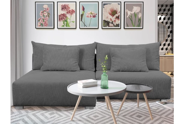 Trendová rohová sedací souprava očalouněna měkoučkou látkou v barvě tmavě šedá. Pohodlně měkké sezení doplňují extra velké opěrné polštáře – dopřejte si tak příjemnou domácí pohodu i v menším prostoru vašeho obýváku. Sedačku lze univerzálně sestavit s otomanem umístěným na pravé anebo levé straně, navíc svými kompaktními rozměry je také vhodná do menšího bytu.