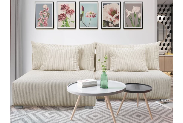 Trendová rohová sedací souprava očalouněna měkoučkou látkou v barvě krémová. Pohodlně měkké sezení doplňují extra velké opěrné polštáře – dopřejte si tak příjemnou domácí pohodu i v menším prostoru vašeho obýváku. Sedačku lze univerzálně sestavit s otomanem umístěným na pravé anebo levé straně, navíc svými kompaktními rozměry je také vhodná do menšího bytu.