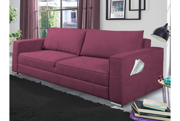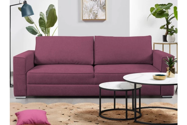 Široká trendová pohovka je prostorná, pohodlná a zároveň praktická. Očalouněna látkou v odstínu fialová lila. S rozkládací funkcí na lůžko, úložným prostorem a zajímavě řešenými bočními područkami, které navíc ukrývají nenápadné kapsy, kam snadno uschováte noviny nebo časopisy.