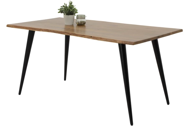 Obdélný jídelní stůl na černé kovové podnoži je vyroben z masivního dřeva. Zaujme na pohled opracovanými hranami do zaoblených tvarů, které podtrhují efekt masivity a přirozenosti.