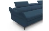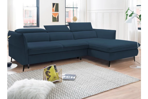 Rohová sedací souprava v trendovém elegantním designu připomíná optiku polštářů. Komfortní sezení doplňují polohovatelné zádové opěrky a nastavitelné boční područky, díky kterým si přizpůsobíte pohodlí podle aktuální potřeby. Sedačka tvořící pravý roh je očalouněna sametově lesklou měkkou látkou v odstínu námořnická modrá. Praktickou stránkou je rozkládací funkce na lůžko a úložný prostor, který se vždy hodí.