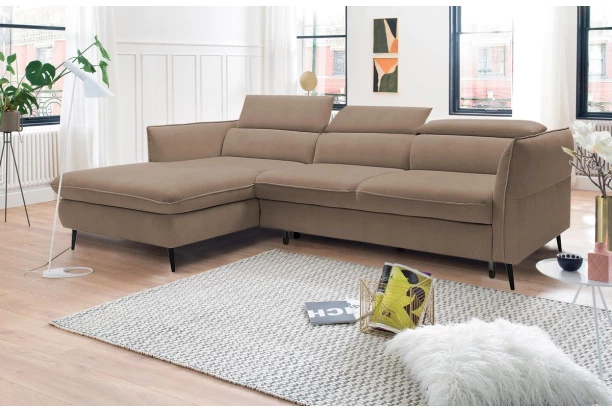 Rohová sedací souprava v trendovém elegantním designu připomíná optiku polštářů. Komfortní sezení doplňují polohovatelné zádové opěrky a nastavitelné boční područky, díky kterým si přizpůsobíte pohodlí podle aktuální potřeby. Sedačka tvořící levý roh je očalouněna sametově lesklou měkkou látkou v odstínu světle hnědá. Praktickou stránkou je rozkládací funkce na lůžko a úložný prostor, který se vždy hodí.