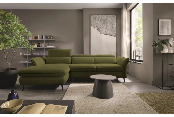 Rohová sedací souprava v trendovém elegantním designu připomíná optiku polštářů. Komfortní sezení doplňují polohovatelné zádové opěrky a nastavitelné boční područky, díky kterým si přizpůsobíte pohodlí podle aktuální potřeby. Sedačka tvořící levý roh je očalouněna sametově lesklou měkkou látkou v odstínu mechová zelená. Praktickou stránkou je rozkládací funkce na lůžko a úložný prostor, který se vždy hodí.
