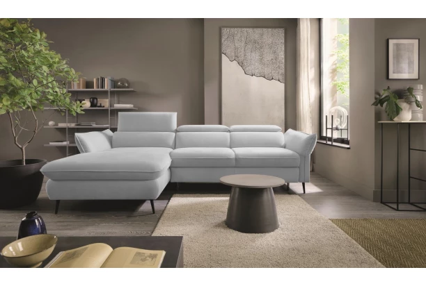 Rohová sedací souprava v trendovém elegantním designu připomíná optiku polštářů. Komfortní sezení doplňují polohovatelné zádové opěrky a nastavitelné boční područky, díky kterým si přizpůsobíte pohodlí podle aktuální potřeby. Sedačka tvořící levý roh je očalouněna sametově lesklou měkkou látkou v odstínu světle šedá. Praktickou stránkou je rozkládací funkce na lůžko a úložný prostor, který se vždy hodí.
